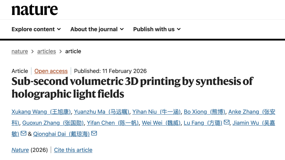 清华大学戴琼海院士团队历经五年攻关,研发出“计算全息光场(DISH)”三维打印技术,将传统体积三维打印曝光速度提升数十倍,创下“毫米尺寸复杂结构曝光时间0.6秒”的新纪录,该技术还可大幅提高体积三维打印的精度未来,有望为相关领域技术升级提供新的解决方案,相关研究成果于北京时间2月12日以《基于全息光场合成的亚秒级体积三维打印》(Sub-second Volumetric 3D Printing by Synthesis of Holographic Light Fields)为题在线发表于《自然》(Nature)。